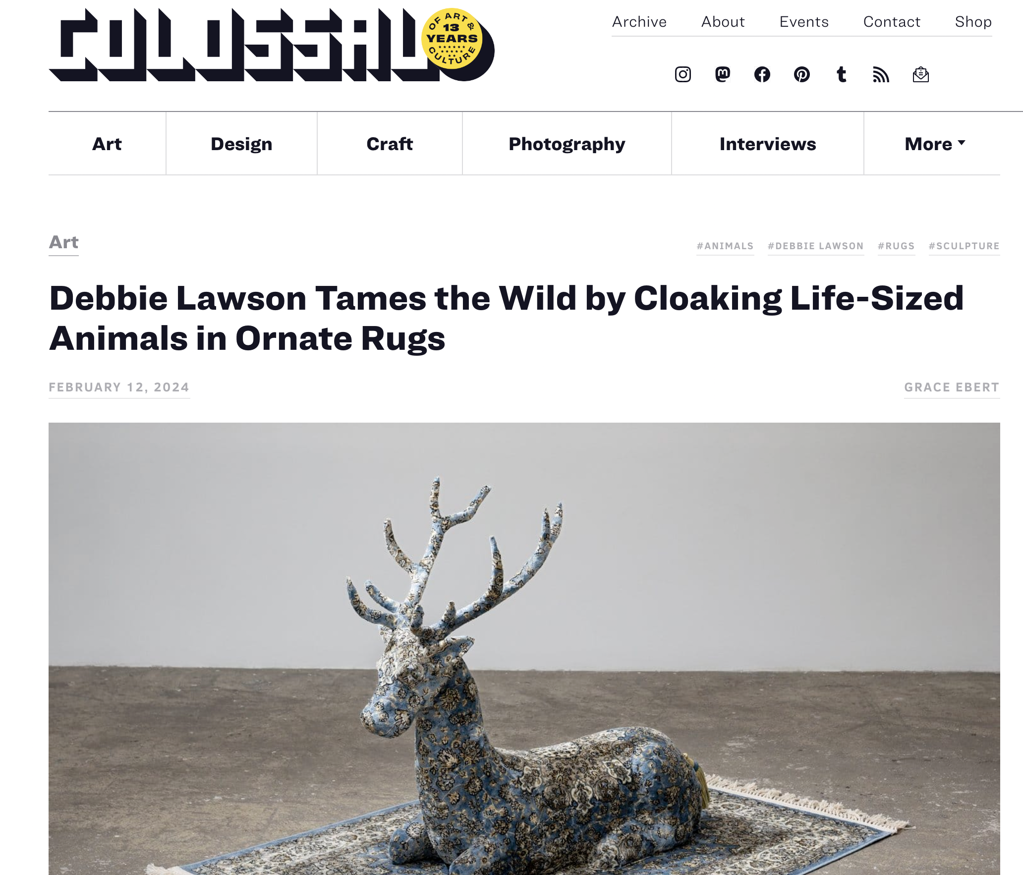 "For Debbie Lawson rugs are a medium… she creates domestic interiors where even plants and coat stands are made of carpet. Whole gardens, complete with flowers and grassy tendrils grow from rugs. In a recent commission she finally got her hands on some real, knotted Persian rugs to create Persian Moose, a wall-hung carpet from which a fully carpeted moose head protrudes."