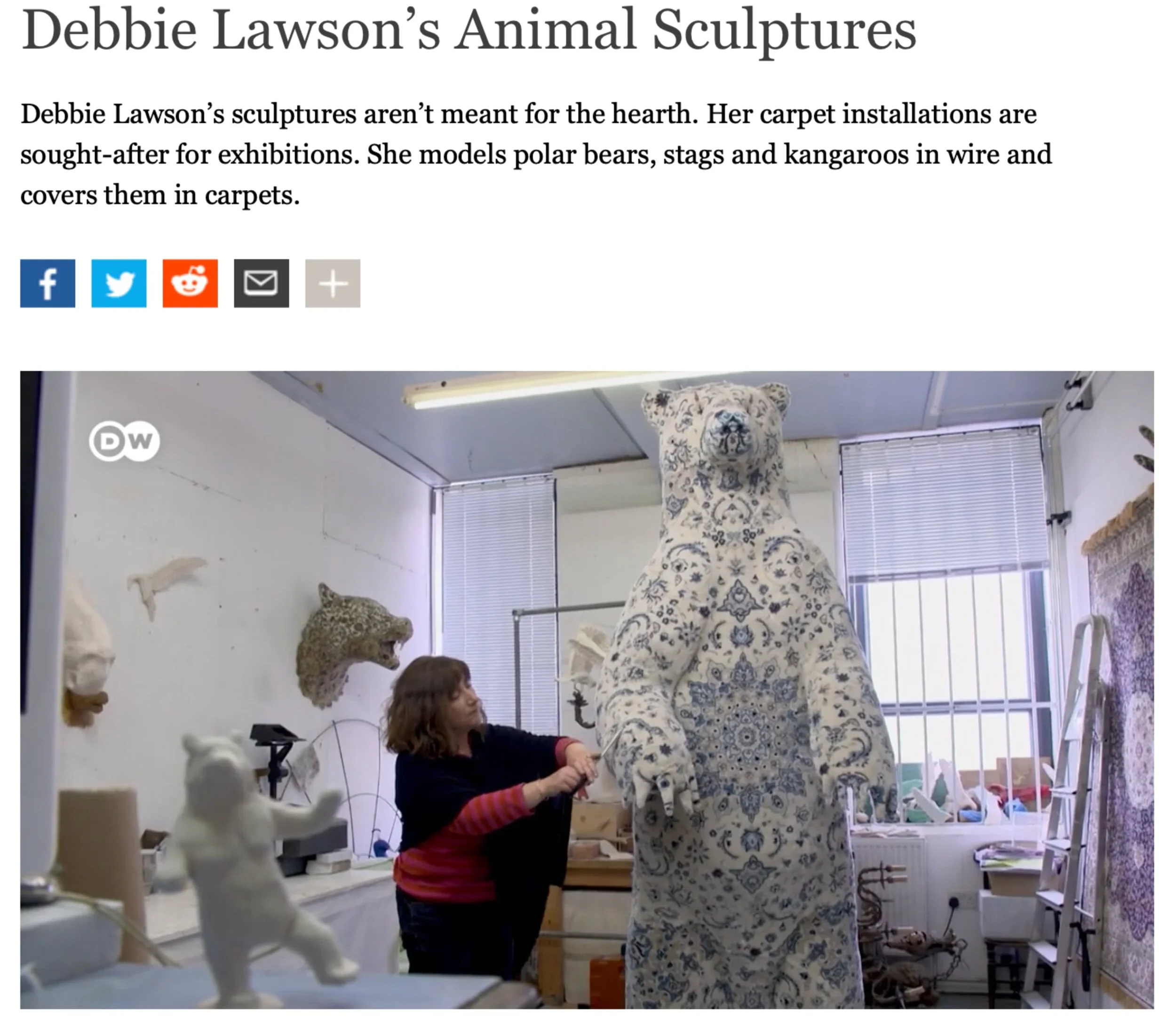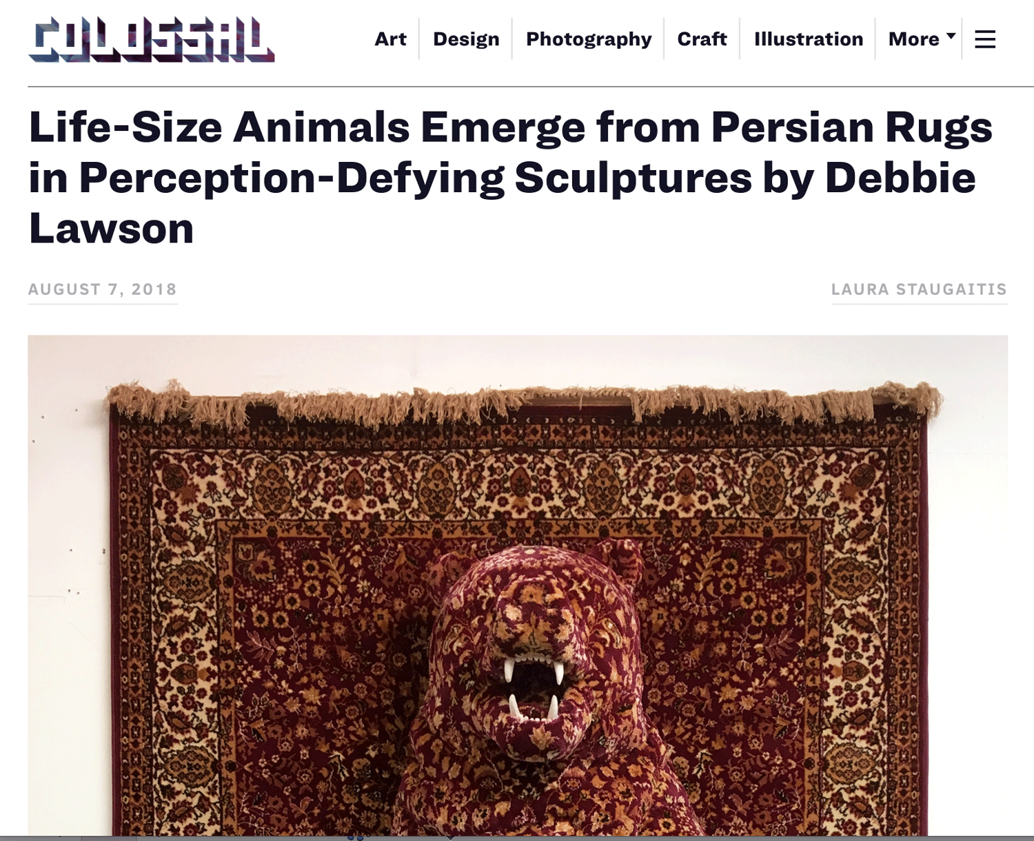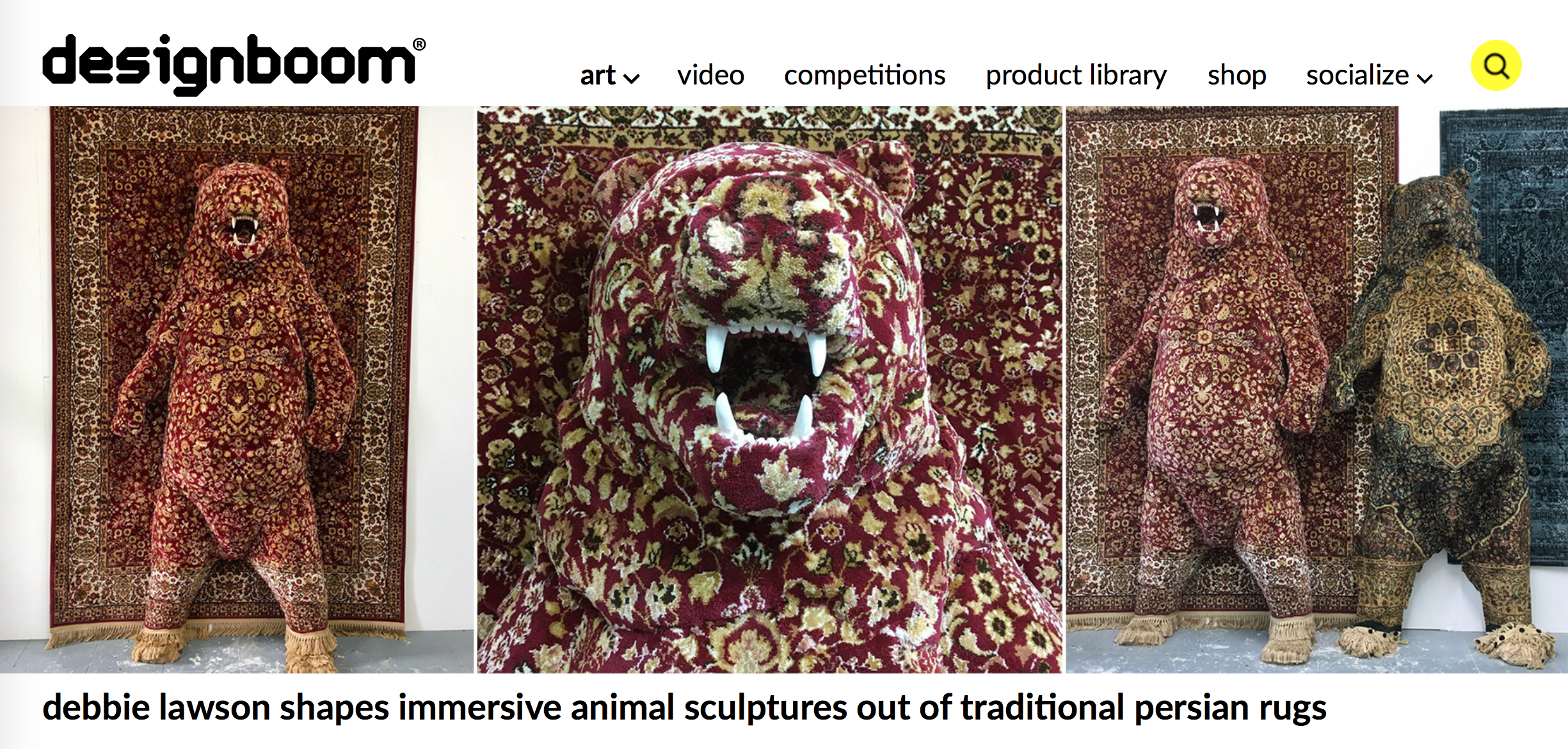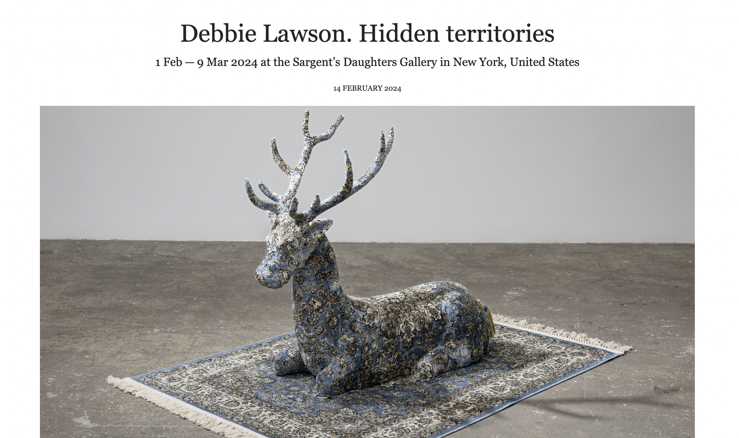 "Debbie Lawson’s magic Persian carpet might be a cheapish factory remake but it fits the enchanting role almost perfectly. These are sculptures in a dream state of metamorphosis in which the tame and domestic comes to life. The 2D rug surface, hung vertically on the gallery wall like a treasure, is inhabited by a half-obscured sculptural menagerie of almost mythical wildlife: a looming hunter’s trophy of a bear, a fox getting up to urban mischief, a flock of seagulls caught in flight like ornamental ducks. The heady incense air of Arabian Nights seeps in as one feels seduced into playful reverie. Anything that infiltrates the safe realms of the family home with hints of unpredictable and uncontrollable spirit is bound to transport us directly back to childhood daydreams."