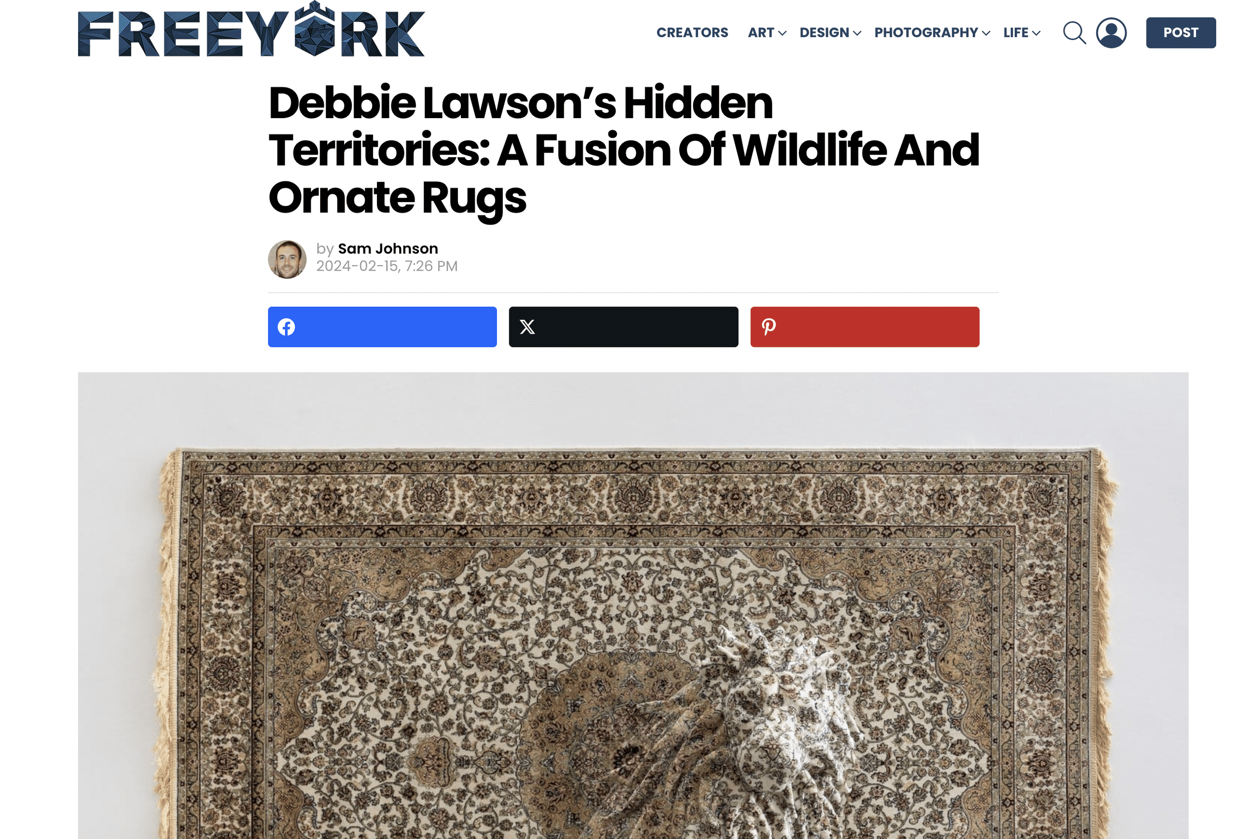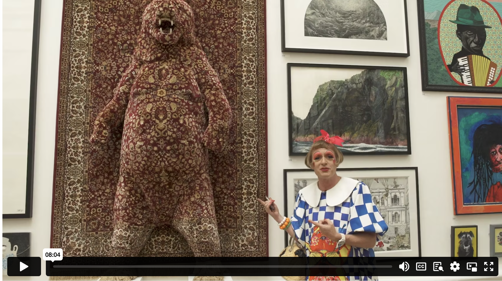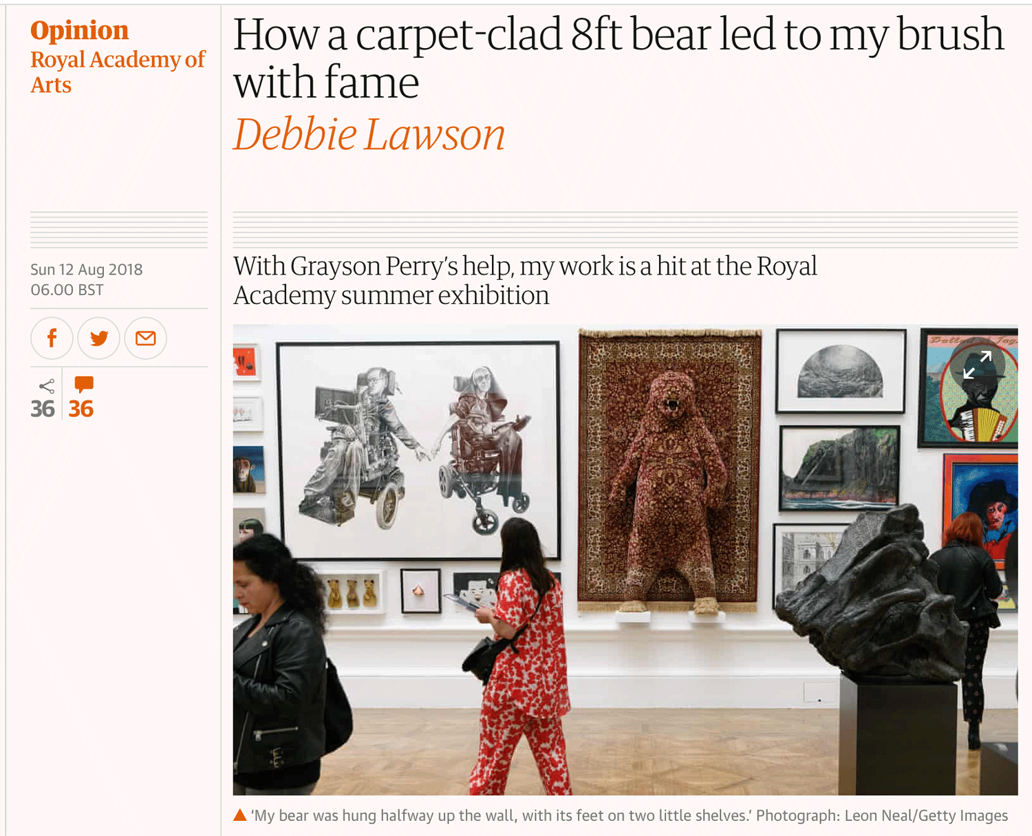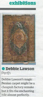 "On the way through the pedestrianised streets of Perth to see Debbie Lawson's Magic Carpet exhibition, I passed an interiors shop with Persian patterned rugs hanging inertly on the wall. Items displayed for sale in this way are a common enough sight on and off the high street. We're also used to seeing them lying flat out in our homes ... but not necessarily in an art gallery. The twist with Lawson's carpets is that she weaves the natural world into them in the shape of goofy-looking grizzly bears, seagulls in perpetual motion, a forest of conifers or a sly little fox emerging from a canopy of ivy. These are all part of the fabric of Lawson's carefully reconstructed world. The carpets she uses might be cheap factory versions of the real Persian deal, but she turns them into beguiling sculptures which I would happily hang on my living-room wall.."