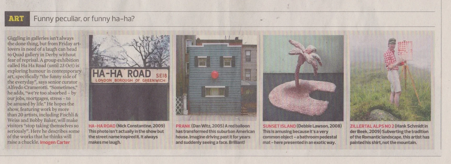 "Giggling in galleries isn't always the done thing, but from Friday art lovers in need of a laugh can head to Quad gallery in Derby without fear of reprisal. A group exhibition is exploring humour in contemporary art, specifically 'the funny side of the everyday', says senior curator Alfredo Cramerotti. 'Debbie Lawson's Sunset Island is amusing because it's a very common object – a bathroom pedestal mat – here represented in an exotic way."